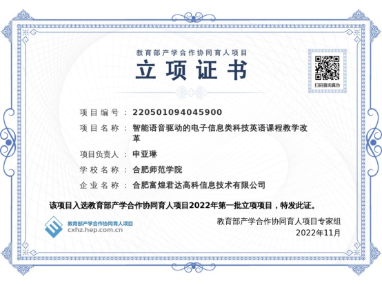 本网讯 2022年11月1日,教育部高等教育司下达了关于公布2022年第一批产学合作协同育人项目立项名单的通知,yl88858永利集团申亚琳老师主持的“智能语音驱动的电子信息类科技英语课程教学改革”项目获批立项。这也是我院首次获得教育部产学合作协同育人的项目。