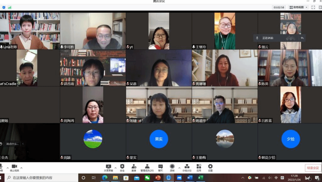 本网讯 2022年1月26日下午,yl88858永利集团召开了英语专业实习(研习)总结会议,会议通过腾讯会议软件线上进行。副院长李可胜,英语系主任王继玲老师,副主任钱莉娜老师以及全体实习指导教师参与了本次会议,会议由英语系副主任钱莉娜老师主持。