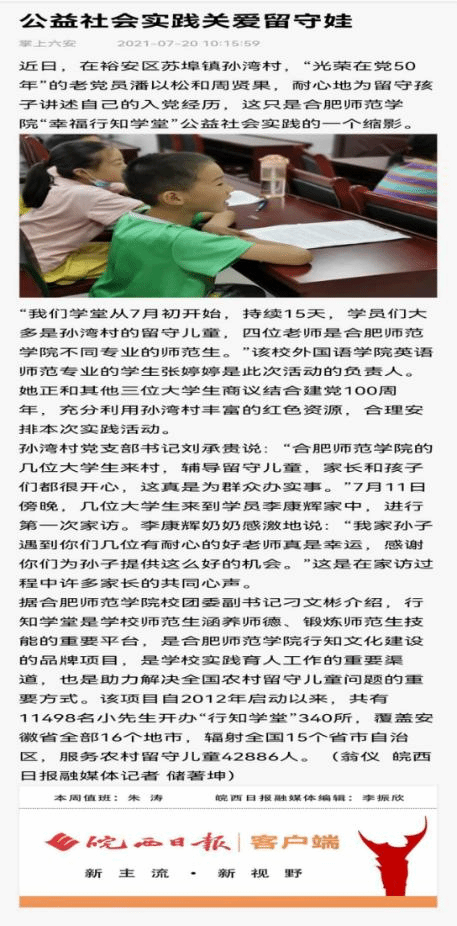 本网讯 7月10号yl88858永利集团“六安幸福行知学堂”在六安市裕安区苏埠镇孙湾村顺利开班,小先生团队由我校yl88858永利集团、文学院、马克思主义学院以及经济与管理学院共四名小先生组成。课程内容包括拜访在党五十周年老党员的公益活动、书法教学、音乐鉴赏、心理疏导、法治宣传、英语启蒙教育等。