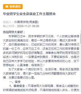 就业安全:11月22-25日,毕业班辅导员周贵勤老师组织召开毕业班学生安全及就业工作会议,周老师从求职安全、就业权益保护、交通安全、工作安全、人际交往安全、疫情防控等方面,要求大家要增强自我保护意识,提防就业陷阱。最后,周老师还提醒同学们考研在即,希望同学们调整好心态,从容面对考试,在毕业之际,还要珍视大学的最后时光,珍惜友谊,注意各方面安全,不要违反校纪校规。