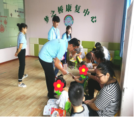 在了解该康复中心的概况和学生情况后,李新宇对这些特殊的孩子们表示特别关心,与各位辅导员老师及“小先生”们一起给小学员们分发慰问品。