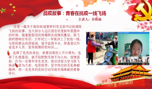2017级英语(师范)2班乔姝涵:讲述了当地党支部书记助理陈飞扬的故事,随着新型冠状病毒肺炎疫情的蔓延,陈飞扬积极响应号召,大年初三一早就冲上了抗疫一线,与居民群众共同奋战,值守监测卡点、排查登记外省返乡人员、宣传疫情防控知识等,乔姝涵表示,作为一名青年学生党员,应该努力学习陈飞扬舍小家为大家,吃苦耐劳、坚守岗位的无私奉献精神,用一名党员的实际行动写就无悔奉献的青春诗行。