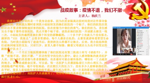 本次活动由学生党支部书记周贵勤主持,各位学生党员共同学习,讲述身边感动的人和感动的战疫故事、讲述自己的切身体会。同时其他党员也就此发表了自己的感悟和体会。