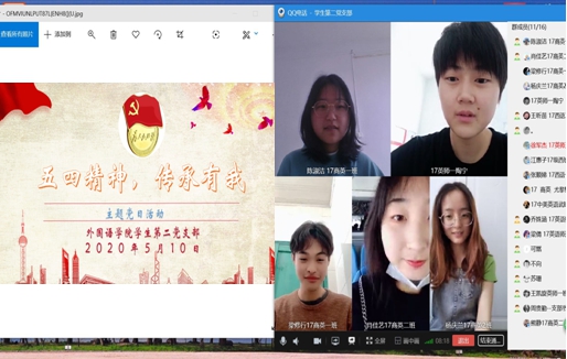 为了深入学习宣传贯彻习近平总书记关于疫情防控工作的系列重要讲话精神,继承并弘扬“五四”精神,进一步激发为决胜全面建成小康社会实现全面振兴的奋斗精神,展现学生党员爱国奉献、勇于担当、乐观进取的精神面貌,5月10日,学生第二党支部线上开展 “五四精神,传承有我”的主题党日活动。
