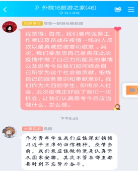 3月3日中午,2018级英语师范2、3班,分别开展“共克时艰难 共同抗‘疫’,学习习近平重要回信精神”主题网络班会,会上,班级同学认真学习贯彻领会习近平总书记重要回信精神,会后,同学们在网络上分享了学习心得,时刻牢记习近平总书记对广大青年学生的殷切期待,努力学习专业知识,练就过硬本领,锤炼品德修为,积极投身祖国和人民需要的地方。感谢习近平总书记爱民如子的关怀、感恩一线工作者全力以赴的大义、感叹中华民族百折不挠坚强不屈的凝聚力,相信我们一定能战胜疫情,再聚樱花下。
