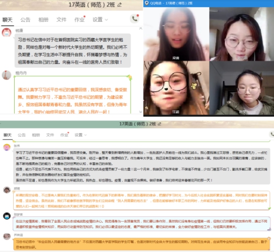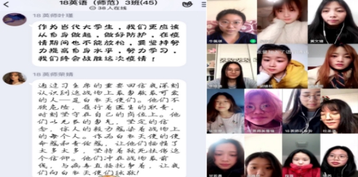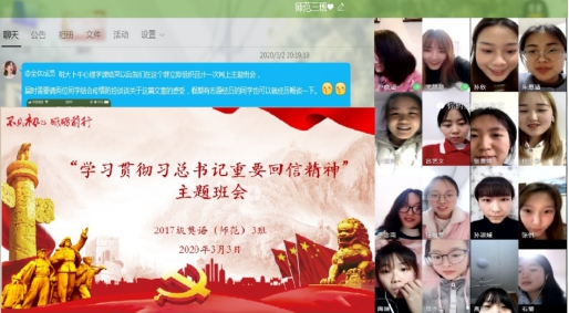 3月3日下午,2017级英语(师范)1、3班网上举行主题班会。以视频会议的形式在班级群内召开,学习贯彻习近平总书记的回信精神,大家通过学习习近平总书记的回信,结合这次的疫情,更加深刻的体会到白衣天使的不易。石莹同学的爸爸是一名医生,她很自豪的说:爸爸在得知去往前线的通知后,心中纵然有不舍,但特别自豪!他从早工作到晚穿着厚厚的防护服,虽然很累很辛苦,但是这份辛苦很值得!”会后同学们纷纷表示会将回信精神与自己的实践相结合,做有理想有担当的新时代大学生。