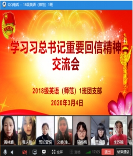 3月4日,2018级英语(师范)1班以视频直播会议的形式举行网上主题交流会,同学们认真学习习近平总书记回信精神,大家踊跃加入线上讨论,畅所欲言,大家一起分享自己的体会和感悟,团支书书记李朝阳同学说:“在抗击疫情期间,全国各地广大志愿者发挥“奉献,友爱,互助,进步”的志愿者服务精神,自己也投身于社区志愿服务,成为生力军中的一员。作为新时代下的接班人,我们更应当肩负历史大任,在报效祖国的成才路上实现个人的人生价值。成也大学,败也大学。大学,足够让你脱胎换骨,完成人生逆袭。但一味沉迷于大学的享受之中,也会让你在未来的某一天里后悔不已”。