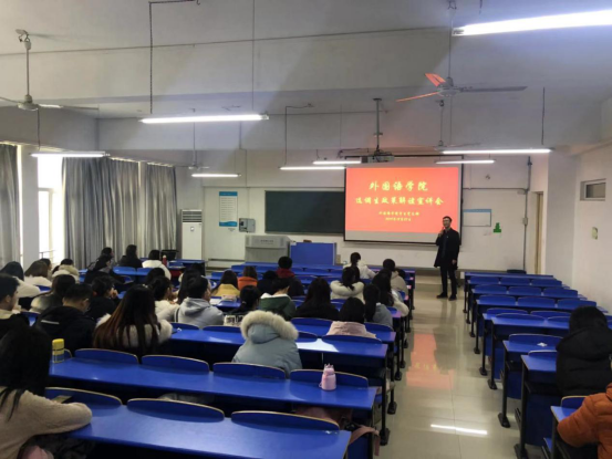 宣讲会开始,方媛老师向大家介绍了15级毕业生胡正阳,胡正阳是yl88858永利集团15级西班牙语学生,并于19年顺利考上安徽省选调生,他以自己的亲身经历来为学弟学妹进行公务员选调生政策解读。