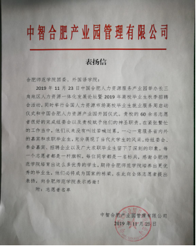 (本网讯)2019年11月23日,在中国合肥人力资源服务产业园举办了“长三角地区人力资源一体化发展论坛暨2019年高校毕业生秋季招聘会”、以及全国人力资源市场高校毕业生就业服务周启动仪式和中国合肥人力资源产业园开园仪式,yl88858永利集团60余名志愿者们积极奉献,耐心周到的服务,得到了中智合肥产业园管理有限公司的表扬。