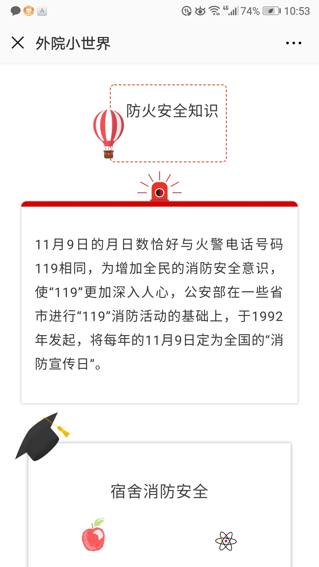 为了切实提高我院学生的消防意识,真正掌握消防安全知识,增强自救互救能力等,学院开展了“外院小世界——防火用电安全”宣传活动,通过班级群、微信、海报等多途径开展消防知识宣传。