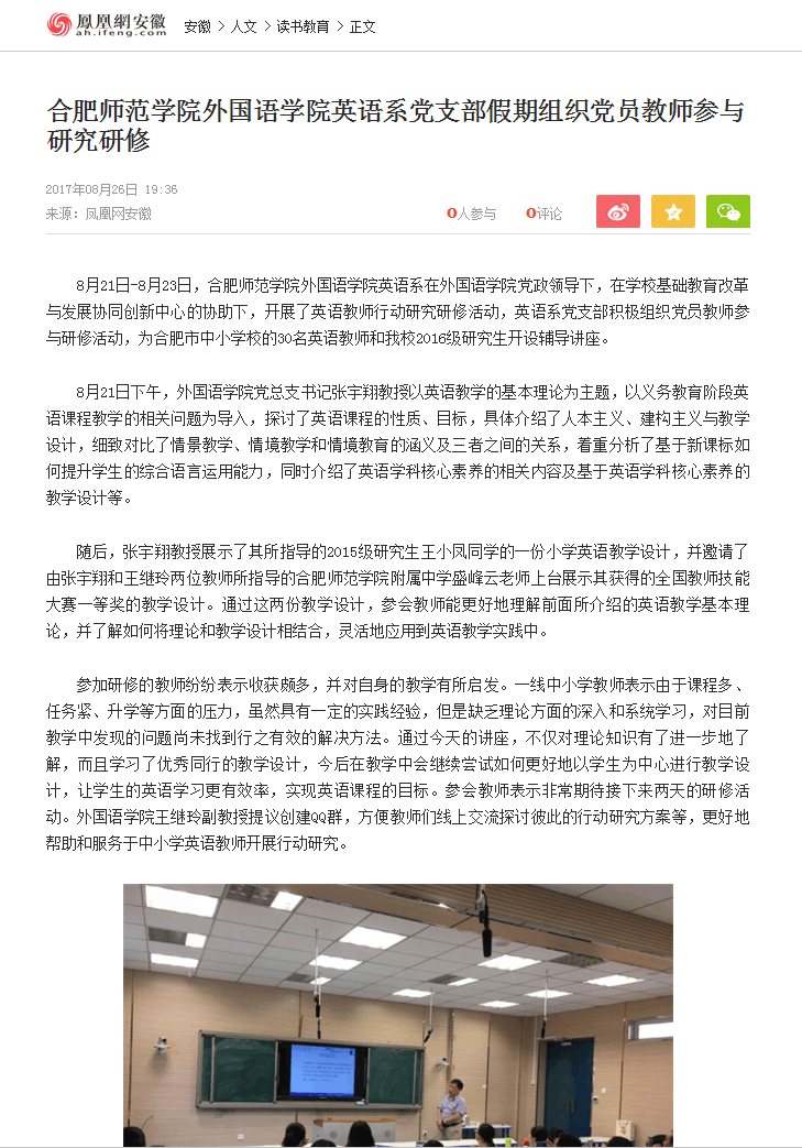 近年来,英语系党员教师指导16名师范生通过校级比赛获得资格,代表85588永利集团参加安徽省师范生技能大赛,分别获得3个省级一等奖,4个省级二等奖,9个省级三等奖;指导2016级研究生党员获校第五届教育硕士研究生教学技能大赛一等奖,指导2015级2名研究生荣获第十届全国高中教师基本功大赛论文一等奖、2014级1名研究生获得全国初中英语课堂教学优秀课展评一等奖,2名研究生获得中国教育学会外语教学专业委员会第十九次学术年会研讨课例优秀教学设计奖;指导的附中盛峰云老师在第十一届全国初中英语课堂教学优秀课展评中荣获一等奖。党支部在服务教学科研上,活动成效明显,暑期开展的英语教师行动研究研修活动,被人民网、凤凰网等主流网络媒体进行了深入报道。(yl88858永利集团陈黎伟)
