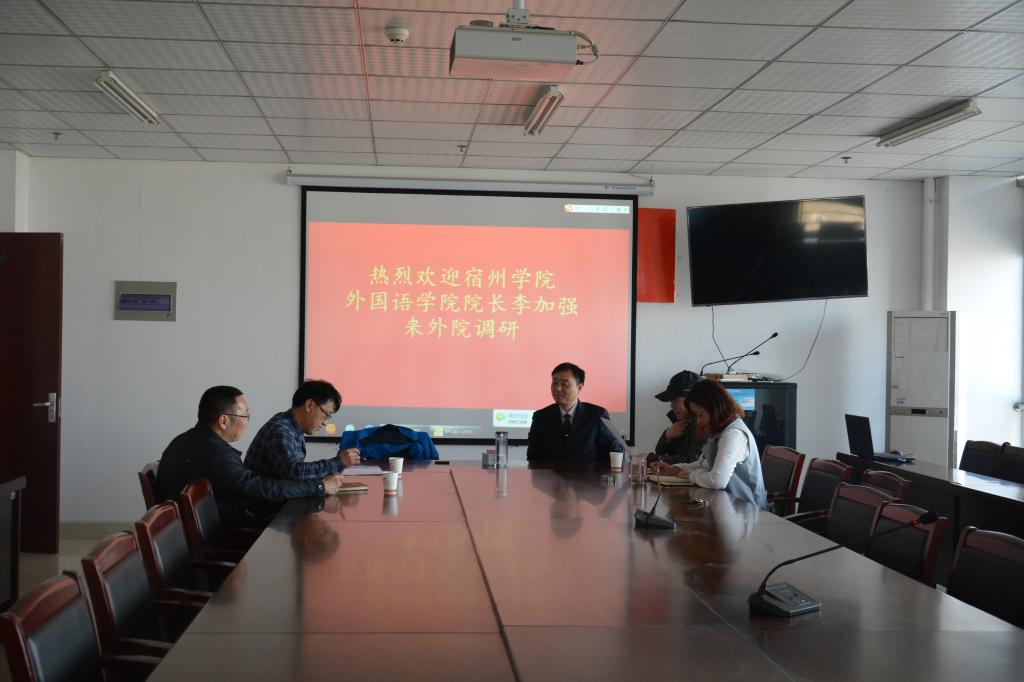 黄波首先代表外院对李加强院长表示热烈欢迎,并简要介绍了外院在审核评估期间所做的重点工作以及关于专业设置、师资队伍建设、实验设备和教科研情况。李加强就宿州学院yl88858永利集团的情况作了介绍。随后,双方就本科专业审核评估中的重要问题进行了热烈而友好的交流,特别对师范专业建设的特色及应用型体现、课程体系建设、大学英语课程建设、大学英语教学改革、教学质量监控、学生试卷、论文、实习、考研、就业等问题进行了较深入的交流。