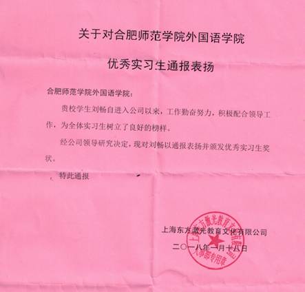 本网讯 2017-2018学年第一学期,yl88858永利集团安排2014级翻译专业刘畅同学在上海东方激光教育文化有限公司进行了为期14周的专业实习工作。刘畅同学遵守公司规章制度,勤奋好学、责任心强、能吃苦耐劳、主动完成实习岗位上的任务,表现优秀,荣获了上海东方激光教育文化公司优秀实习生称号。实习结束,上海东方激光教育文化有限公司对外院实习生给予了高度评价,并专门寄给外院一封信,对外院刘畅同学进行了通报表扬。(yl88858永利集团 胡元霞)