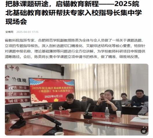 报道称,陈英副教授作为省教科院指派的专家,围绕办学质量提升、课题研究等关键议题展开深入探讨,为推动皖北地区基础教育教研发展提供新思路与方向。在活动中,陈英副教授为全体与会人员做了关于课题选题与申报书撰写的专题指导报告。