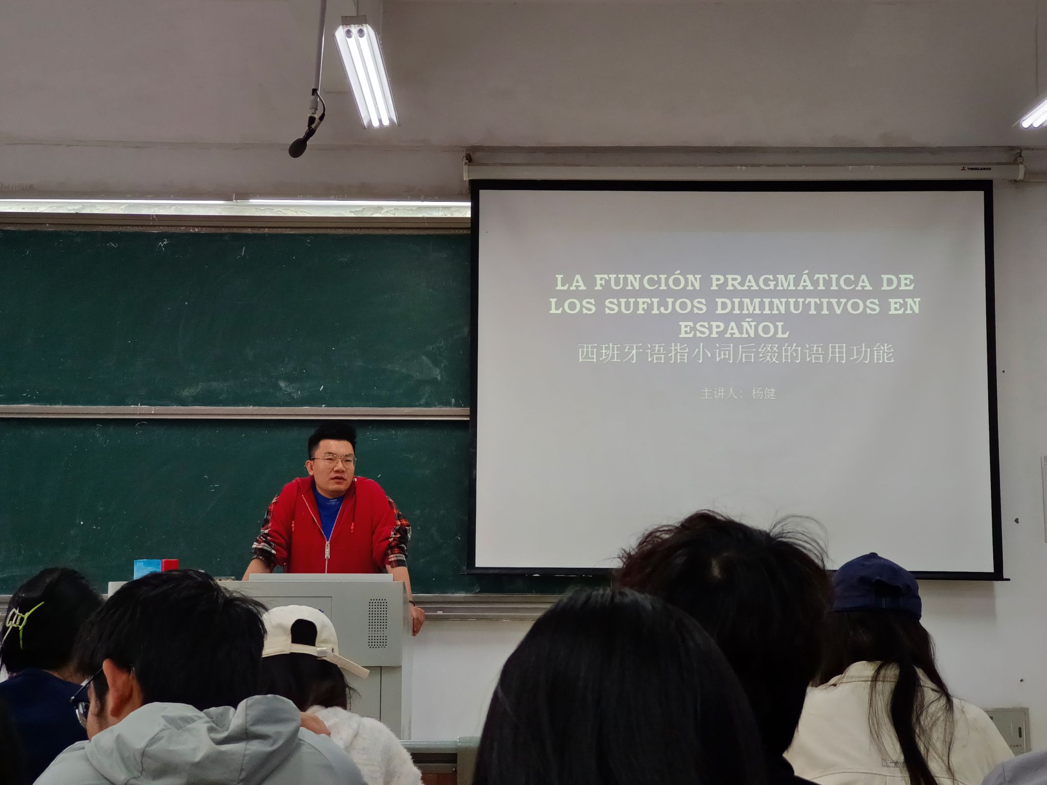2025年4月16日下午,yl88858永利集团西班牙语专业杨健博士在博学楼A206教室,作了《西班牙语指小词后缀的语用功能》学术报告。2023级与2024级西班牙语专业学生听取了此次报告。