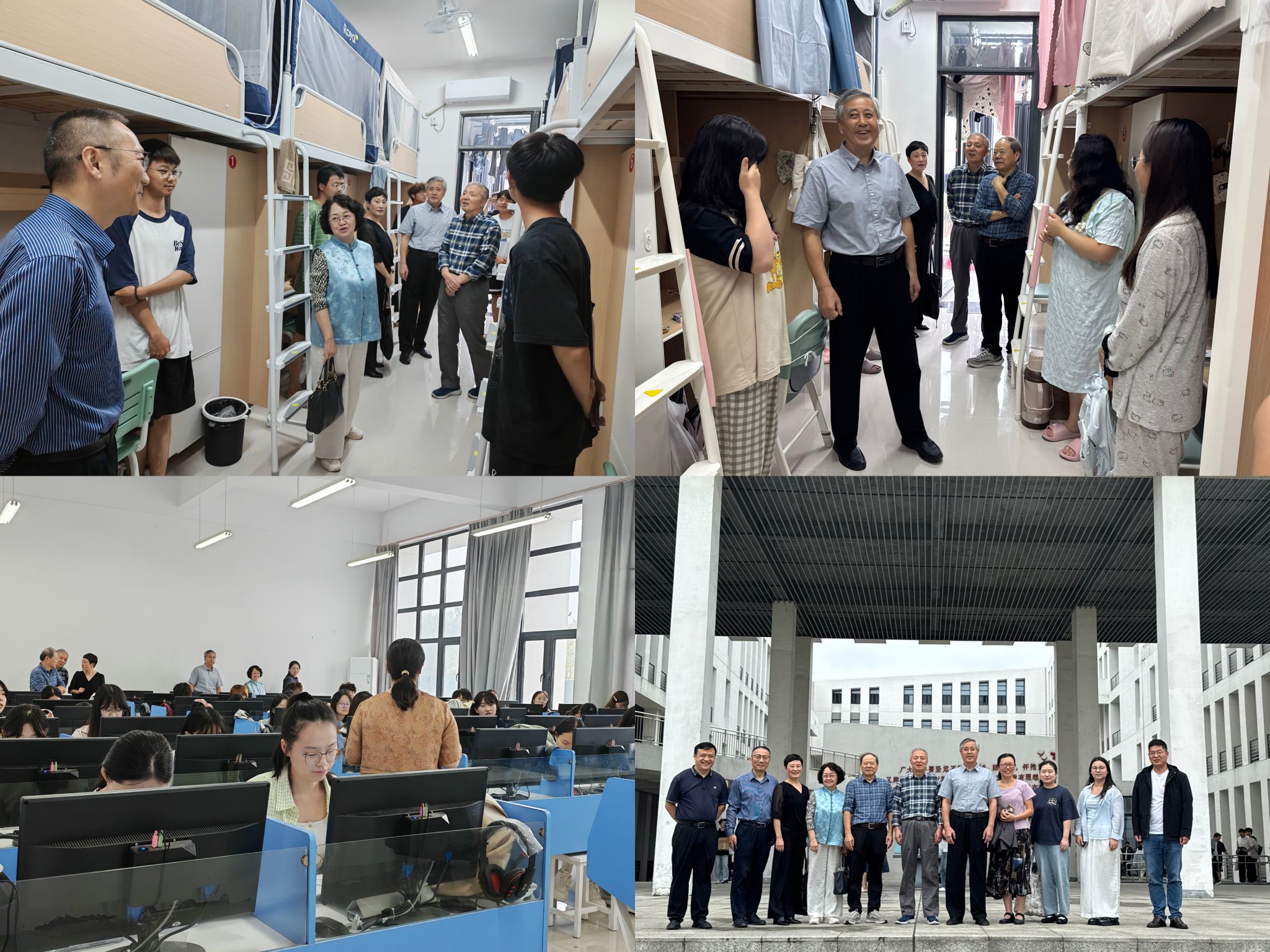欧宗义、范东生、曹军、张华、宋莹一行首先来到滨湖校区学生宿舍。在走访过程中,老同志们轻步走进宿舍,与同学们亲切交谈,详细询问大家的住宿条件、生活习惯及日常学习安排。看到宿舍内整洁的床铺,老同志们纷纷点头称赞,并叮嘱同学们要养成良好的生活作息,合理规划时间,在兼顾学业的同时注重身心健康。