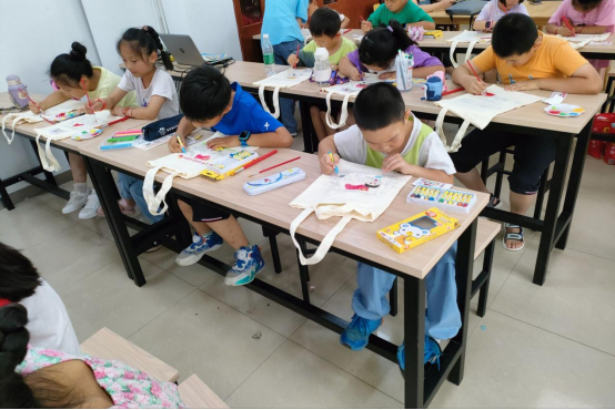 正值7月1日建党节,首节课,小先生们带领小学员们举行“红领巾心向党”帆布包绘画活动,以此加深小学员们对于党的了解和热爱。